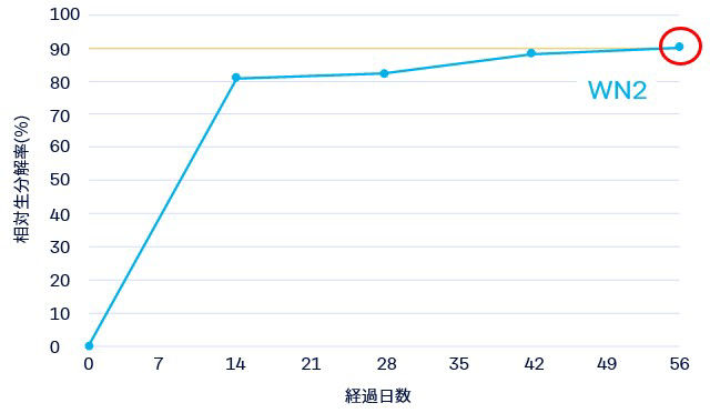 本試験において、WN2銘柄の水溶液は、2か月以内に90%以上生分解する結果が得られました。