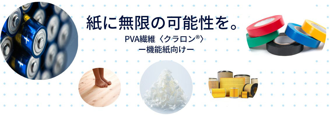 〈クラロン®〉は高い耐アルカリ性を有し、紙力向上に寄与します。親水性にも優れ、パルプやレーヨン、ガラス繊維、さらにゴム・セメント・樹脂など多様な素材と良好に馴染みます。幅広い繊度と豊富なラインナップで、用途に応じた紙質設計が可能です。当社では機能紙用の繊維のほか、〈クラロン®〉を使用したビニロン紙も取り扱っています。