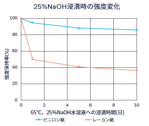 ビニロン紙はレーヨン紙と比べて高い強度保持率を保っています。