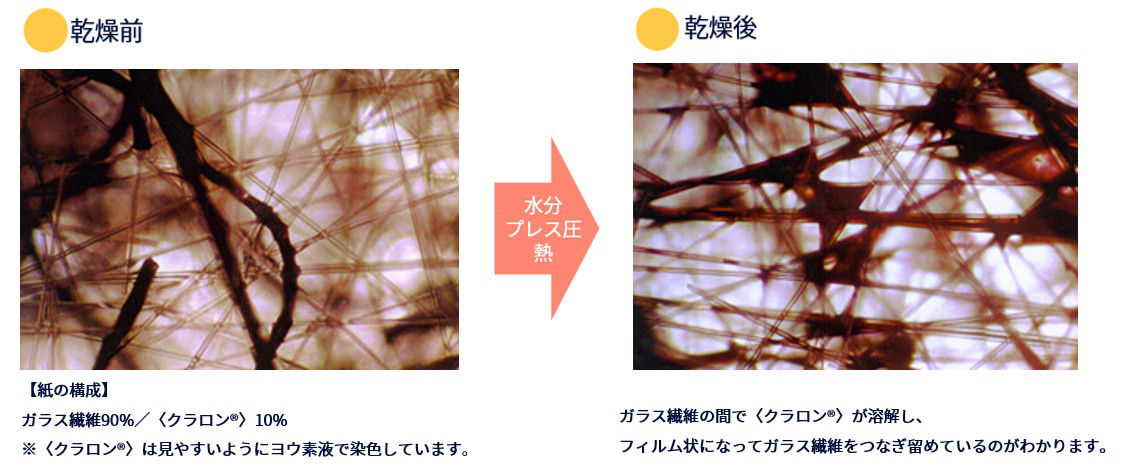 〈クラロン®〉はパルプ・レーヨンといった有機繊維だけでなく、ガラス繊維やカーボン繊維といった無機繊維の製紙にも利用できます。